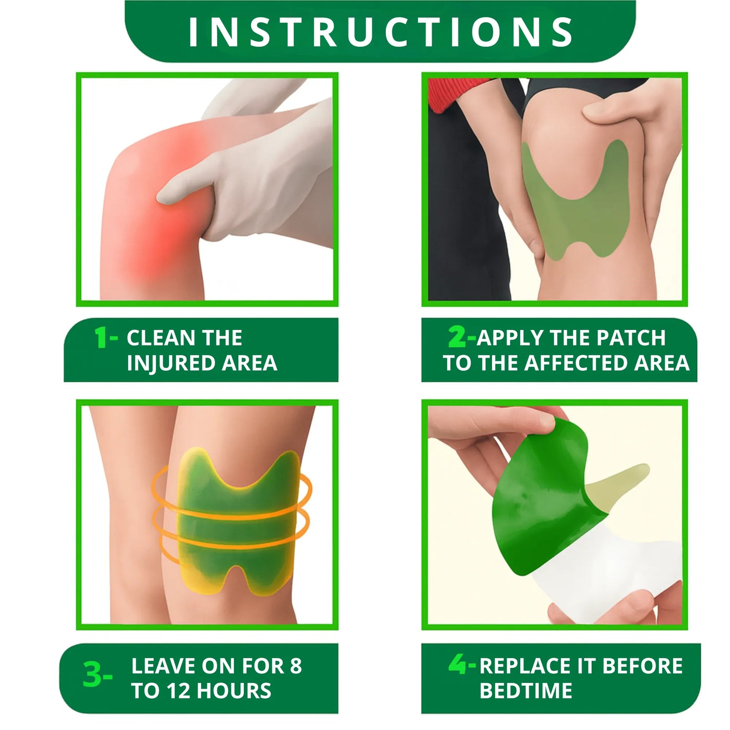 Simply clean the area, remove the protective film, and apply firmly to the painful knee.