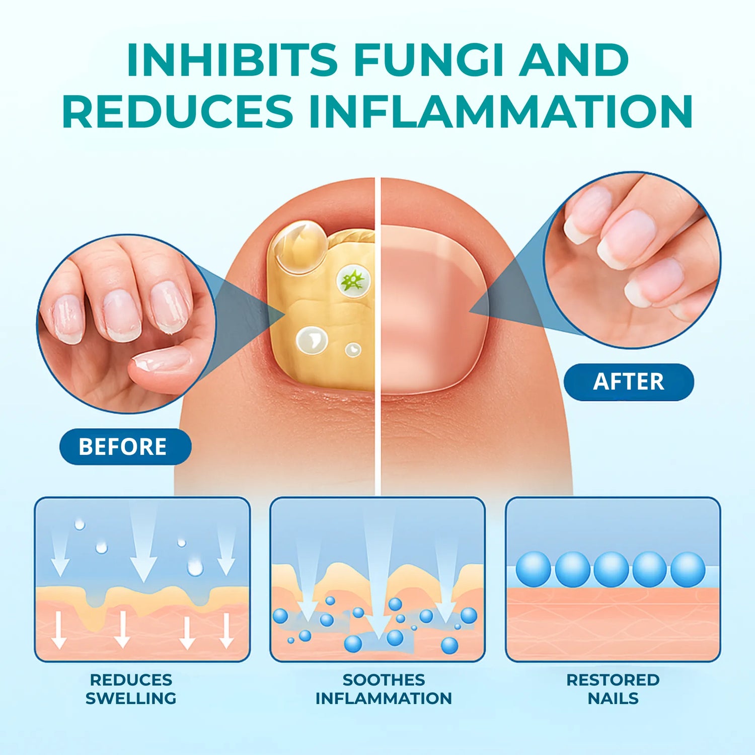 - Combines essential oils with antifungal and anti-inflammatory properties to eliminate fungi and accelerate nail regeneration.
